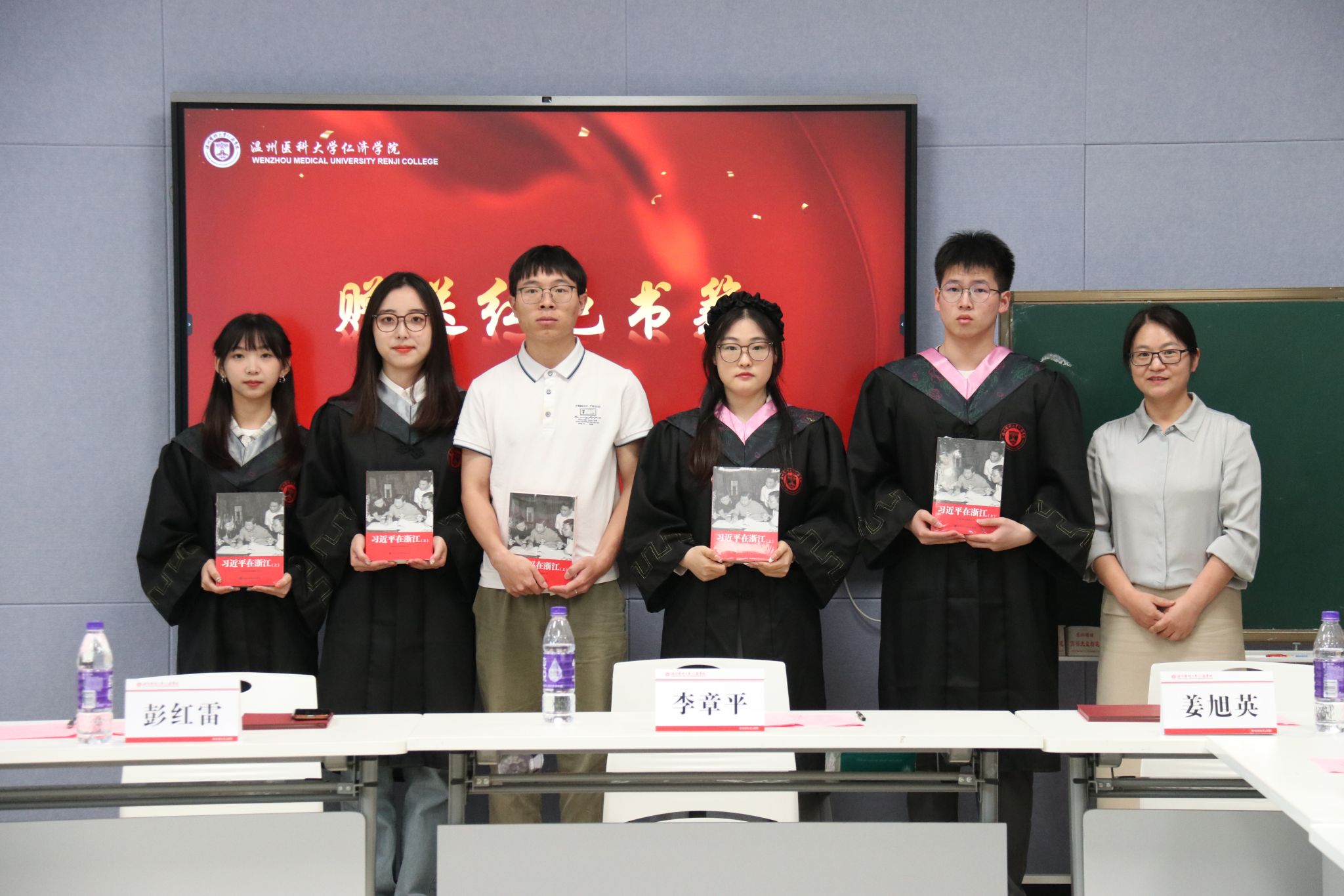 姜旭英代表色花堂 向参会的毕业生代表赠送书籍,鼓励大家要做有理想、有本领、有担当的新时代青年。