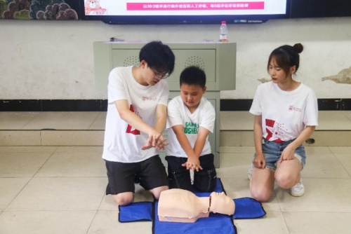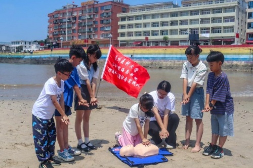 “防溺水”安全教育专题中,“小蜜蜂课堂”立足“防”字,突出“救”字,将情景模拟与现场演练有机结合,于室内模拟儿童失足落水情景,室外海滨“全真模拟”急救演练,现场讲解心肺复苏动作规范要领,在立体化、沉浸式的课程模拟演练中提高儿童安全健康意识和助己助人能力,筑牢海岛居民安全防范意识堤坝、紧绷海岛儿童溺水“预防弦”,为平安温州贡献青春医学力量。