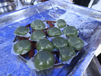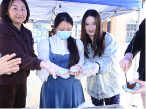 学生们邀请了社区的宿管阿姨参与本次实践课堂,黄阿姨耐心地指导着她口中的“孩子们”放馅、包粿。正所谓“捣青草为汁,和粉做团,色如碧玉”,一团团黛绿映入眼帘,这一刻,便是春意盎然。