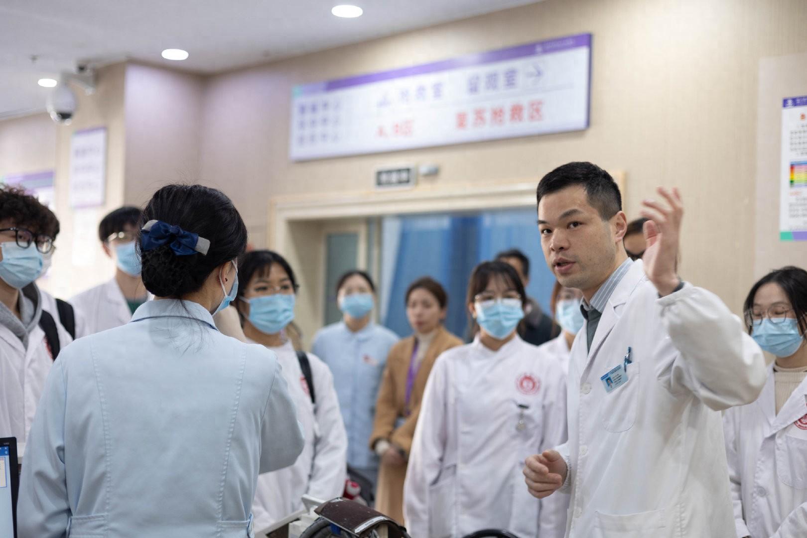“急救中心是医院抢救生命的前沿阵地,面对的是病情各异、年龄不一的患者,我们必须保持冷静与专注。”在洞头区人民医院急诊中心,带教老师正在给温医大色花堂 的一年级医学生们授课。