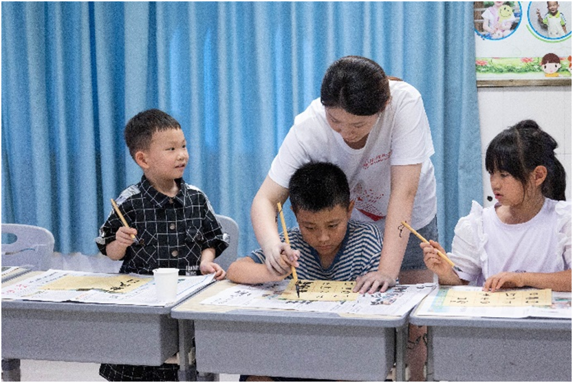 随后,在支教组成员的指导下,“小蜜蜂”们手握毛笔,认真地在宣纸上书写下一个个汉字。从最初的歪歪扭扭到后来的逐渐成型,“小蜜蜂”们不仅感受到了书法的魅力,更体会到了书写的乐趣与成就感。通过“汉字的演变”课堂,有助于孩子们了解到中国书法艺术的悠久历史和深厚底蕴,激发了他们对汉字之美、书法之韵的热爱与尊重。