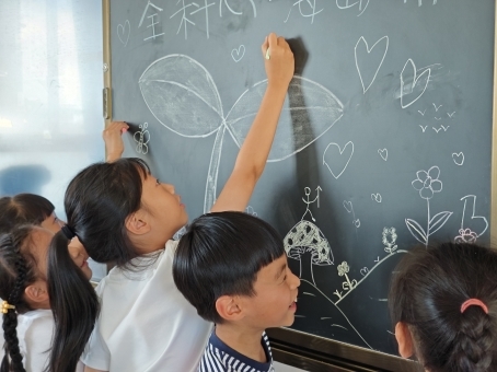 7月8日下午14点,与一年级1班和一年级7班的班主任进行简短的工作交接后,支教组成员开始课前的准备工作,绘制“小树苗”课堂的黑板报。随着一声“姐姐,你们在干什么呀?”稚嫩的童声响起,盛赛琪老师的视线对上了一双天真可爱的眼睛,“我们带来了‘小树苗’课堂,要一起画吗?”紧接着,支教组的3位小老师邀请了小朋友们共同完成了教室黑板的布置,在欢声笑语中“小树苗”课堂的序幕由此揭开。