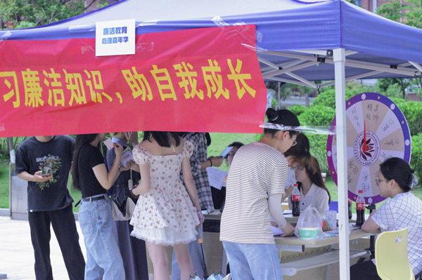 “校园廉洁文化建设的主体是谁?”“对任何腐败分子必须怎么做?”“‘世界是你们的,也是我们的’打一成语”……面对廉洁知识相关问卷调查、猜字谜、文字拼接活动,同学们积极参与竞答,在欢乐的气氛中进一步增强自身的廉洁意识,从而激发思想上、行动上的自觉。一位同学表示,“总以为廉洁是领导干部的事情,跟我们学生无关。通过这次活动,我对廉洁有了新的认识和看法,也明白了在今后的学习工作生活中要诚实守信、自律自立、踔厉奋发,努力把自己培养成德智体美劳全面发展的社会主义建设者和接班人。”