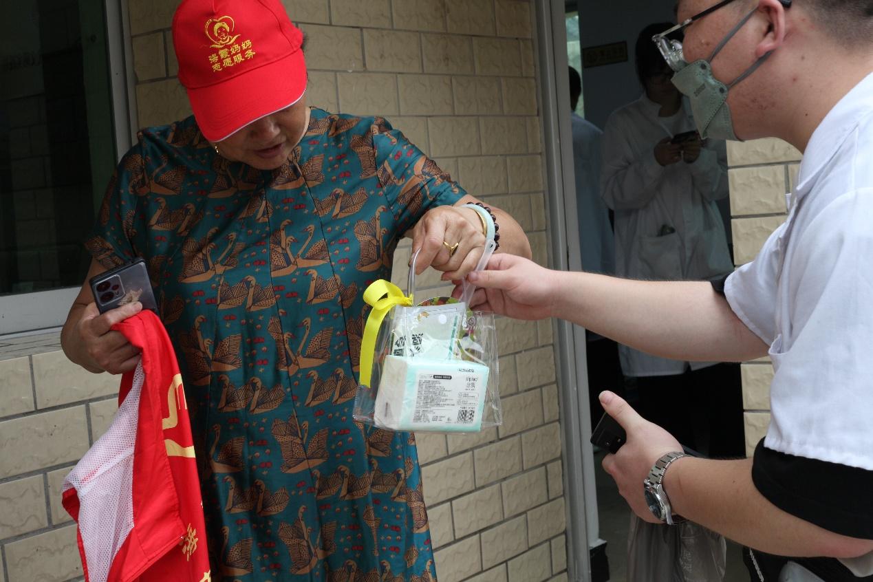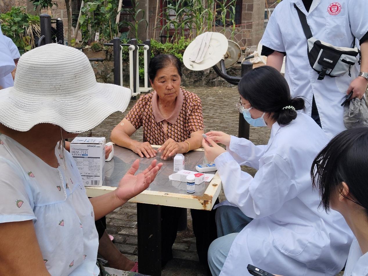 除医疗服务之外,我们还精心策划了一系列人文关怀活动:为金婚夫妇补拍结婚纪念照,镜头记录下陈大爷为老伴整理鬓角的温情瞬间;设计发放蕴含海洋文化元素(渔船图案)的健康知识手册及装有本地草药的保健香囊,手册内页附有“坚持泡脚”“节制饮酒”等本土化健康提醒;建立完备的居民健康档案体系,并制定定期回访计划,确保服务长效延续。当现代检测设备与传统艾烟在村文化礼堂交织,这场健康服务已超越单纯的医疗援助,成为连接仁济学子与海岛老人、传递关怀与希望的暖心纽带。