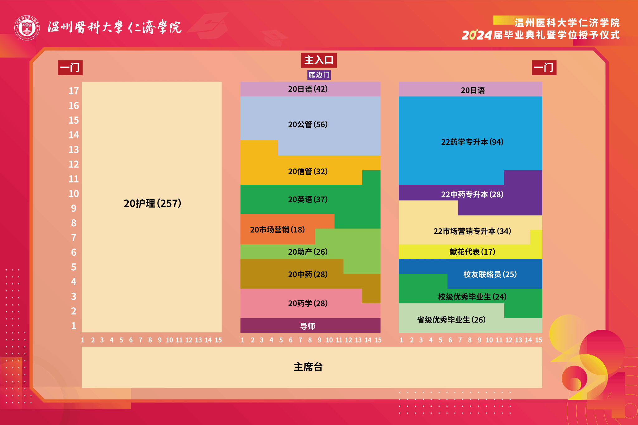 1. 请参加毕业典礼暨学位授予仪式的学生穿好学士服(里面白色衬衫、深色长裤、皮鞋或深色鞋子,学位服着装要求见附件),在当天下午1:15之前按划分的场地入场完毕(见下图),会议期间请将手机调至静音或振动状态。