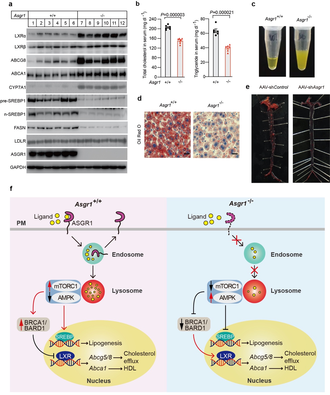 a,蛋白质免疫印迹分析显示在Asgr1敲除小鼠的肝脏中介导胆固醇外排的蛋白增加。b,Asgr1敲除小鼠的血清中胆固醇和甘油三酯水平显著降低。c,Asgr1敲除小鼠胆汁浑浊,提示胆汁中胆固醇增多。d,Asgr1敲除小鼠的肝脏脂质减少。e,减少Asgr1表达预防动脉粥样硬化斑块形成。f,ASGR1作用模式图简介。