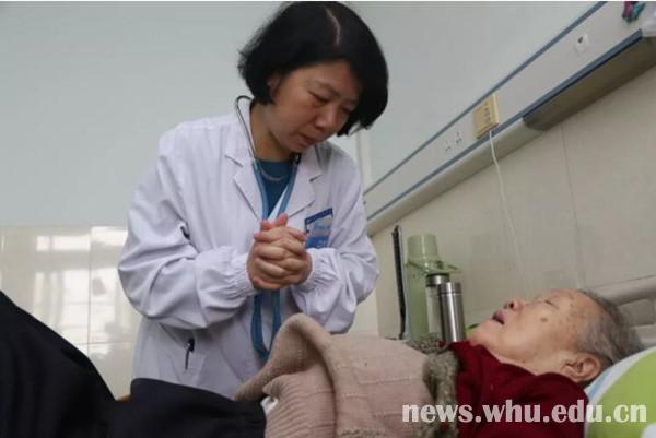 ▲图中老人的老伴在综合病房治疗了9个月,本月17号因肺癌去世。金雅磊不断安慰老人。老人与她拥抱了半个小时,表达对中南医疗团队的感谢。
