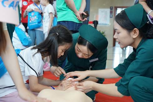 人民医院东院区儿科和急诊科的医务人员轮番上阵,以寓教于乐的形式,给孩子们和家长传授中暑、溺水、烧烫伤等各种极端状况下的急救方法。
