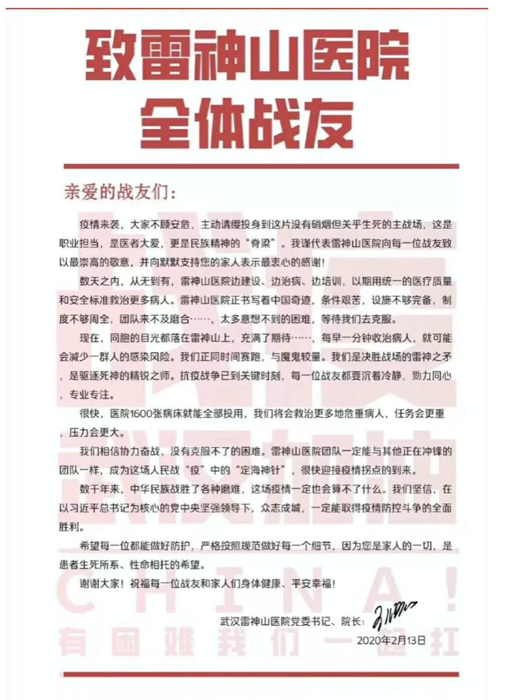 中南医院院长,武汉雷神山医院党委书记、院长王行环发表“致雷神山全体战友的一封信”,号召全体医护人员众志成城,坚决打赢防疫阻击战。
