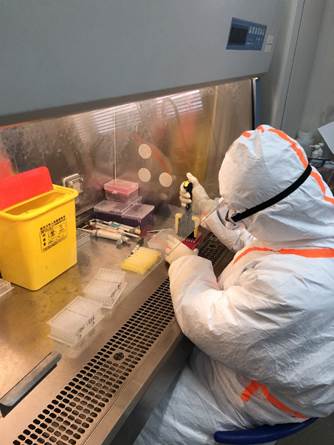 检验医学科拥有一个独立的P2实验室。检测试剂盒抵达后,这里被确定为专门检测新型冠状病毒场所。实验室经过周密部署并对照既往标准,在人员配置、设备安置、检测试剂性能评价和生物安全防护等方面进行了合理化调整,从最初的常规核酸检测流程迅速转变到新型冠状病毒核酸规范化检测流程中。30多人组成的团队实行全天24小时4班轮换工作方式,在P2实验室日夜奋战。