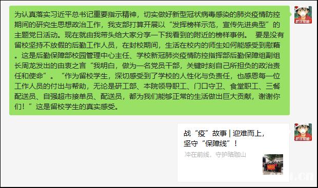 疫情当下,学院党政领导、管理干部、辅导员、班主任、导师等,坚守岗位,集体上阵,通过一对一微信/QQ、微信/QQ群和电话等形式与全院师生保持密切联系,随时沟通,一日一报,第一时间掌握全院师生的思想动态和身心健康情况,把组织的关怀送到每一个人身边。学院也一直把离退休的老同志挂在心上,对离退休老同志进行了疫情防控工作统计和宣传。