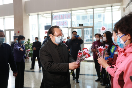今年“三八”妇女节正值抗击疫情关键时刻。校党委书记韩进专程来到奋战东院的一线医护人员中间,为他们带来色花堂