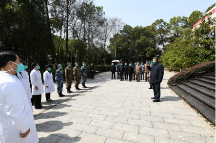 在医院办公楼外广场,习近平接见了湖北省当地和军队、外地支援湖北医护人员代表。习近平指出,在湖北和武汉人民遭受疫情打击的关键关头,广大医务工作者坚韧不拔、顽强拼搏、无私奉献,展现了医者仁心的崇高精神,展现了新时代医务工作者的良好形象,感动了中国,感动了世界。当前,疫情蔓延扩散势头已经得到基本遏制,防控形势逐步向好。这是全党全国全社会共同努力、团结奋斗的结果,你们是最大的功臣,党和人民要给你们记头功。党中央和各方面将一如既往大力支持湖北和武汉抗击疫情工作,一如既往全力提供医疗物资支援,一如既往为大家解除后顾之忧。党中央和全国人民永远同你们在一起,永远是你们的坚强后盾!在疫情防控斗争进入关键阶段,气可鼓不可泄。要一鼓作气,咬紧牙关,坚持到底,扛得住,守得住,不能前功尽弃。医务人员健康是战胜疫情的重要保障。很多同志在这里奋战一个多月了,很辛苦、很疲劳,希望你们注意休息,保证营养,保重身体。有关方面要改善大家工作生活条件,落实好各项防护保障措施,加强轮换和休整,尽最大努力确保一线医务人员健康和安全。