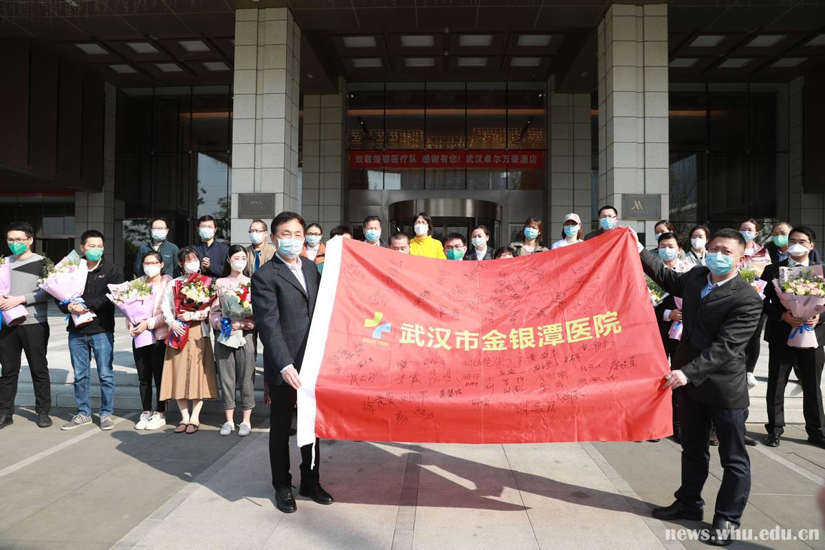 在欢送仪式上,金银潭医院党委书记王先广、院长张定宇等为支援医疗队员逐一献花,表示感谢。两家医院代表在双方院旗上签名并交换。副院长黄朝林宣读了武汉市金银潭医院致色花堂