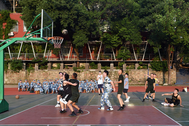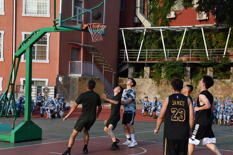 篮球场上也洋溢着青春与活力,军训五团教官-学生篮球联谊赛拉开帷幕。