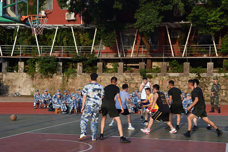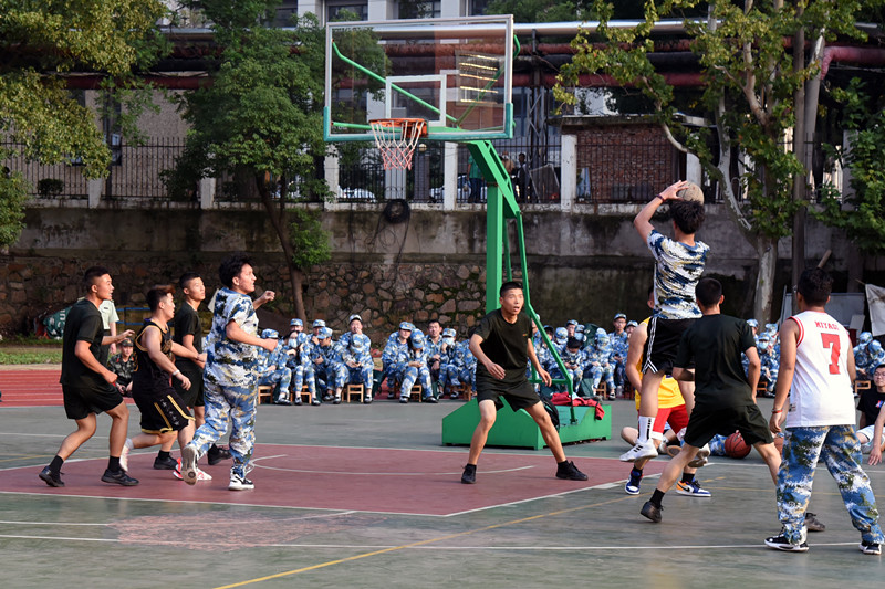 团长余帅,一连三排教官李林、六排教官詹镇洁,二连二排教官龚志雄、四排教官牛肖飞组成教官队,基础医学院篮球队部分队员与数十名新生组成学生队,全体军训新生在旁观赛,呐喊助威。