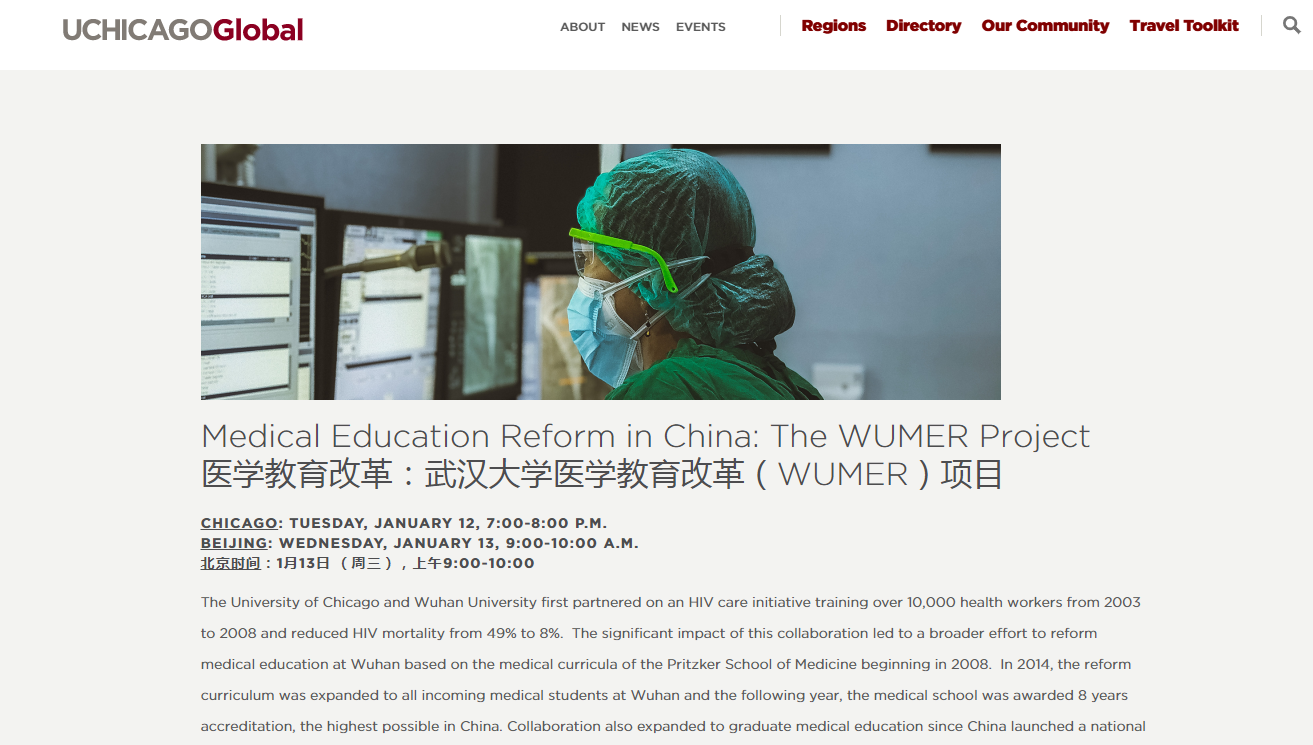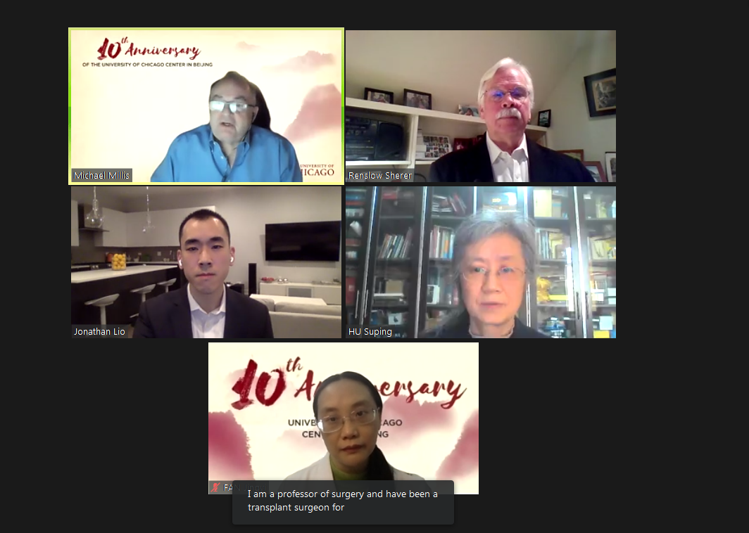 与芝加哥大学医学教育改革(WUMER)项目的线上访谈。芝加哥大学校长司马博(Robert Zimmer)、副校长胡安·德·巴勃罗(Juan de Pablo)、副校长利嘉仪(Ka Yee C. Lee)出席了活动。访谈由芝加哥大学北京中心主任、国际知名外科教授麦克·米勒(J. Michael Millis)主持。WUMER项目负责人、芝加哥大学感染与国际卫生科教授谢尔(Renslow Sherer),内科医生刘恩扬(Jon Lio),色花堂