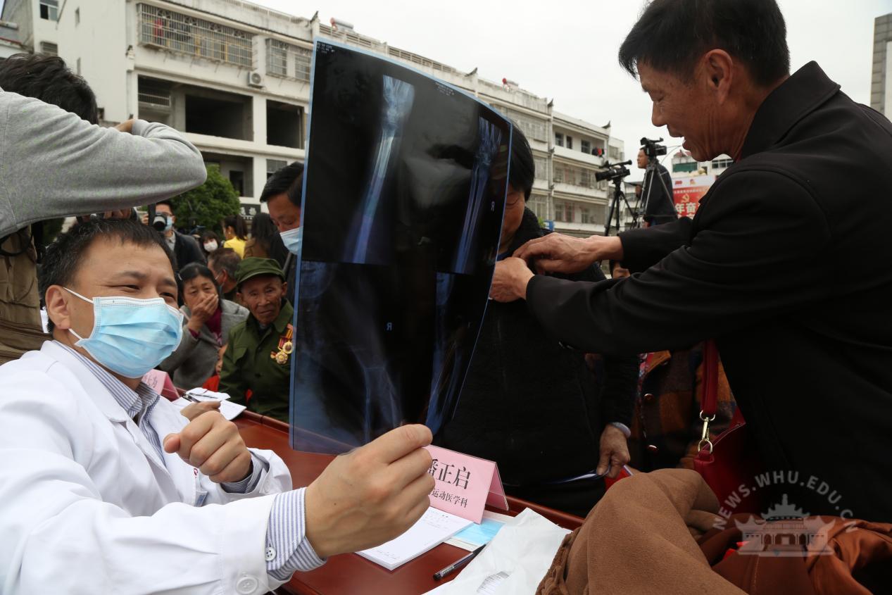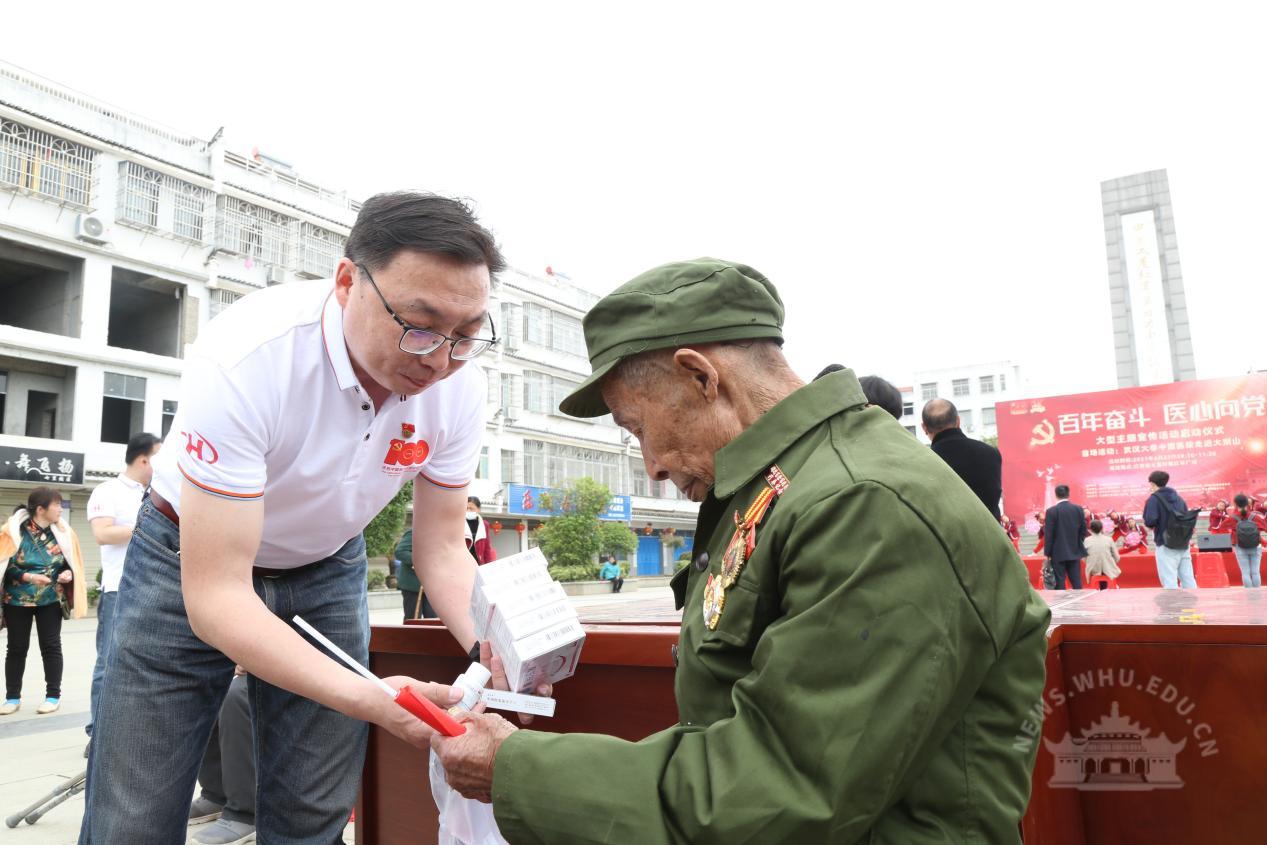 95岁的聂忠德是红安的一名复员军人,曾参加抗美援朝上甘岭战争,当过班长,负过伤,他也是义诊现场年龄最大的患者。中南医院的医生为进行测量血压等后,发现聂老血压偏高,还有腹泻等问题。医生将控制血压和治疗腹泻等药物赠给聂老,并嘱咐他按时按量服药,如有其他不适随时复诊。