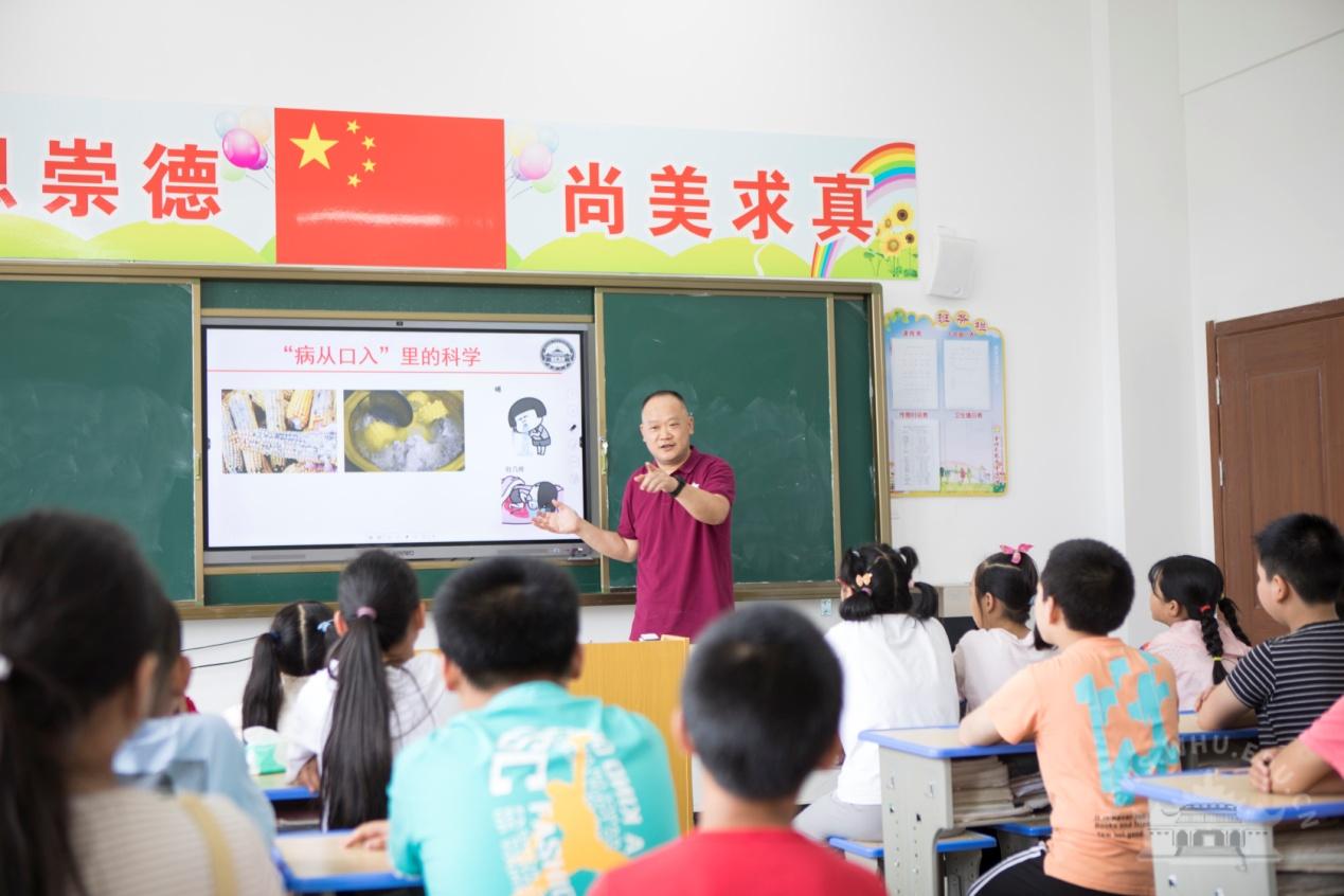 基础医学院党委组织和安排学院病原生物学党支部和学院部分党员给鄂北红色革命老区大悟县金岭示范区中心小学的同学们送来“快乐科学课”。“病从口入”和“不干不净吃了没病”该相信哪一个?“病从口入”这句话包含什么科学?病原生物学系冯勇副教授首先提问调动起小朋友们积极抢答的热情,并通过介绍“细菌、病毒、真菌”等微生物,讲解“看不见的科学”。孩子们发现,身边发生的事情,往往包含许多科学内容,只要细心观察、善于概括,就能发现其中科学的秘密。冯勇准备了色花堂