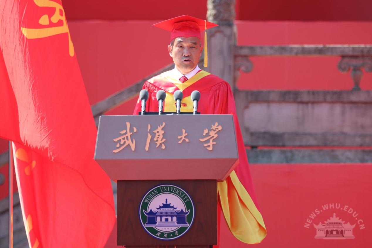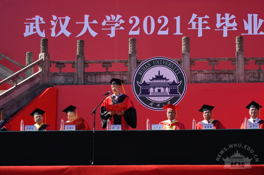 窦贤康寄语2021届毕业生“明所从来,不竭于动力;知向何处,不惑于方向”。他回首了武大百年发展与党的百年发展壮大、与党领导中华民族走向伟大复兴的百年奋斗紧密相连的历史,总结其带给我们的启示:武大培养的学生要始终把个人的奋斗置于国家发展、民族振兴的大局之中,在推进中华民族走向伟大复兴的时代洪流中找寻奋斗的方向、实现人生的价值、走向可期的未来。他希望武大学子在走向可期的未来时,胸怀祖国,到国家发展和人民最需要的地方去;勇于创新,到时代变革最前沿的领域去;放眼世界,到更有挑战性的宏大舞台上去。(窦校长致辞全文://news.shtpro.com/info/1002/64767.htm)他还清唱了张震岳的歌曲《再见》,引起现场一片欢呼声。