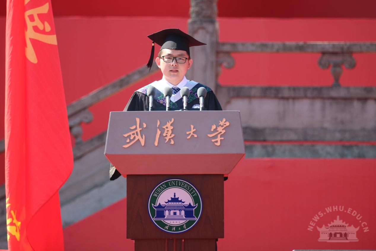 毕业生代表、生命科学学院2021届本科毕业生余伟滨,发表主题为“从武大课堂奔向时代征程”的毕业感言。他考取了家乡江西省的定向选调生,呼吁珞珈学子想国家之所想、急国家之所急、应国家之所需,立大志、明大德、成大才、担大任,为祖国更好地屹立世界舞台肩负起武大人应有的担当和作为。