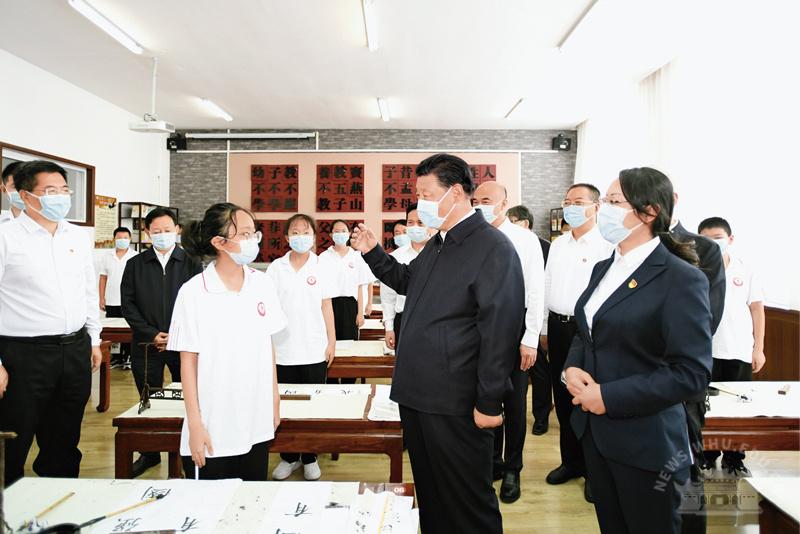 2021年9月13日至14日,中共中央总书记、国家主席、中央军委主席习近平在陕西省榆林市考察。这是14日上午,习近平在绥德实验中学考察时,同正在练习书法的学生亲切交流。新华社记者李学仁/摄