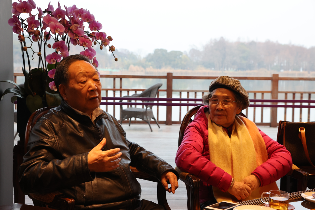 朱裕璧女婿李德仁院士和女儿朱宜萱教授在东湖边接受人民日报健康客户端采访。张赫摄