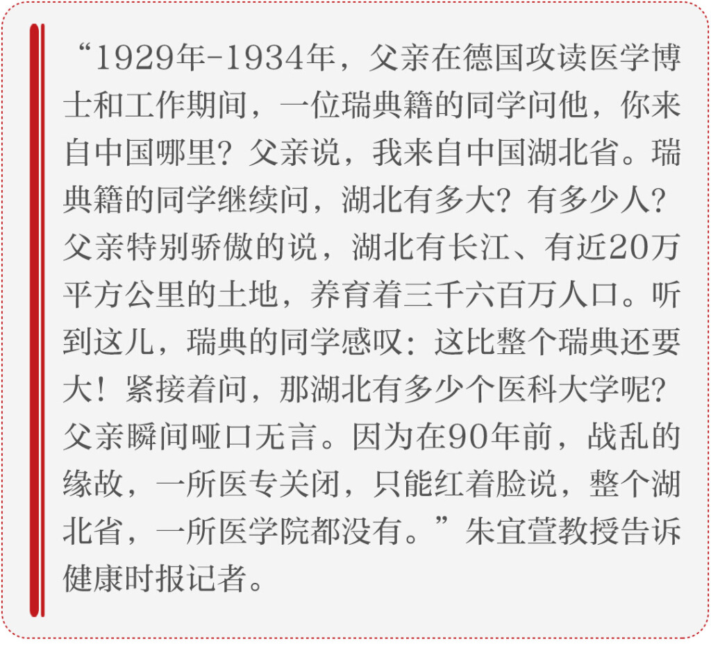 朱宜萱回忆,后来很多人问父亲,一个不和平的年代,为什么要用那么多心血去建医学院,做一个外科医生不好吗?每每这时,父亲都会很坚定地说,我永远记得那位比利时同学知道整个湖北没有医学院时的眼神儿,当时,就发誓要在湖北建一所医学院。