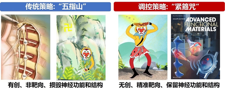 心源性猝死的传统干预手段为手术切除损毁,会导致手术创伤和出血、感染等并发症,还会永久丧失其本身的生理结构和功能,好比“五指山”。而江洪教授团队提出的为过度激活的交感神经“炸弹引线”戴上“紧箍咒”的可逆性调控策略,在正常状态下保留其生理功能,仅在异常激活状态下进行精准调控,以预防恶性心律失常和心源性猝死的发生。
