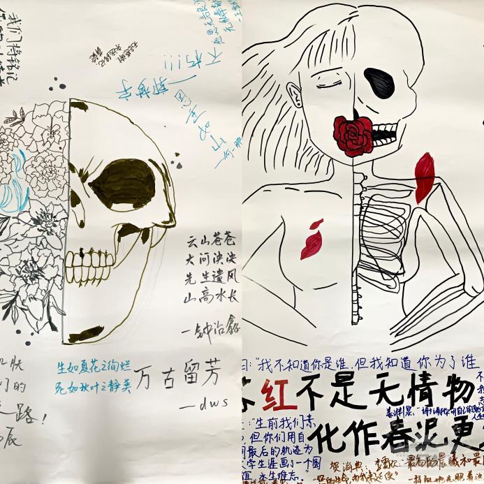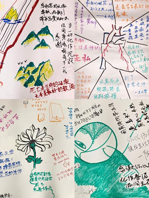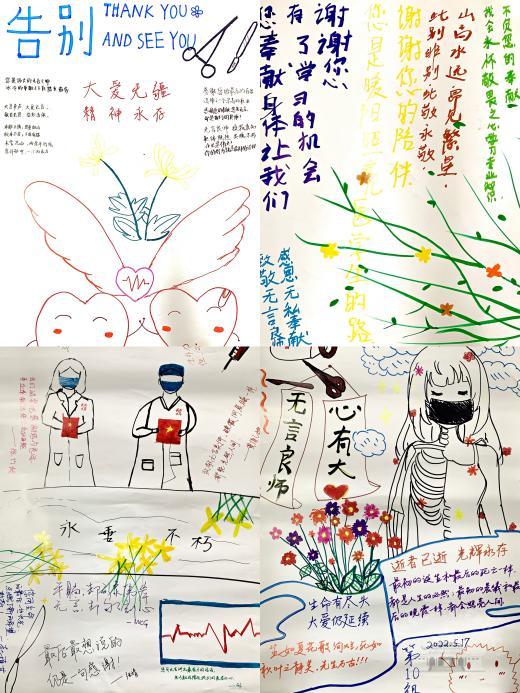 两岸茫茫,大体老师跨越了分隔生死的渡河;岁月悠悠,无言良师化身烛火让生命的温度延续。告别仪式上,同学们把对无言良师相伴成长的感恩与怀念通过一张张海报展现出来。海报或精致、或朴素、或意象丰富、或寓意深远,承载着同学们对每位大体老师由衷的感谢和敬仰:“以身为光,向死而生,身形减损,光芒永存”“我不知道你是谁,但我知道你为了谁”“平躺,却形象伟岸;无言,却句句刻心”“死亡是生命的延续,无言是最好的教诲”……