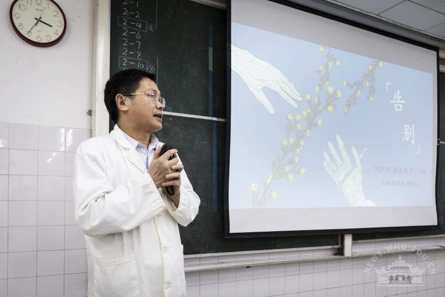 在告别仪式上,人体解剖学教研室副主任雷岳山老师代表全体老师发言。他指出,大体老师的奉献是同学们成长的基石,他们的无言付出更是同学们前进的动力。希望同学们在今后的学习生活中,铭记无言良师的恩泽,对生命常存敬畏和感恩之心,增强救死扶伤的职业责任感与使命感,同时也寄语同学们在人体解剖课程结束后,开启更加辉煌的医学新征程。
