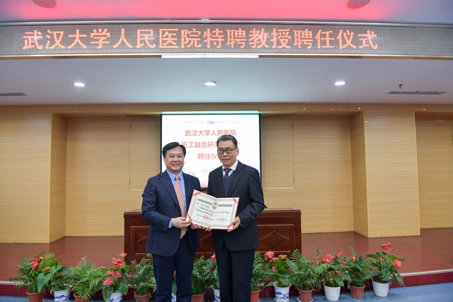 人民医院医工融合研究院的揭牌及刘胜教授的受聘表示祝贺。他表示,人民医院的发展目前进入关键时期,最近也是喜事连连。最新一期国际顶级期刊《自然》杂志在线发表了人民医院学者为第一作者的研究论文,实现了科研上的重大突破。近几年人民医院在各大榜单上全面快速进步,2020中国医院科技量值综合排名位居全国医院综合排名第20,较2019年再前进6位,医院发展呈现出蓬勃向上的势头。人民医院确立了建设“世界一流医院”的发展目标及“三步走”的发展战略,因此医院从人才储备、硬件设施等各方面都按照一流目标来推进。今天的合作签约是一个重要的突破,要再次对医工融合研究院的成立及刘胜教授的受聘表示热烈祝贺。