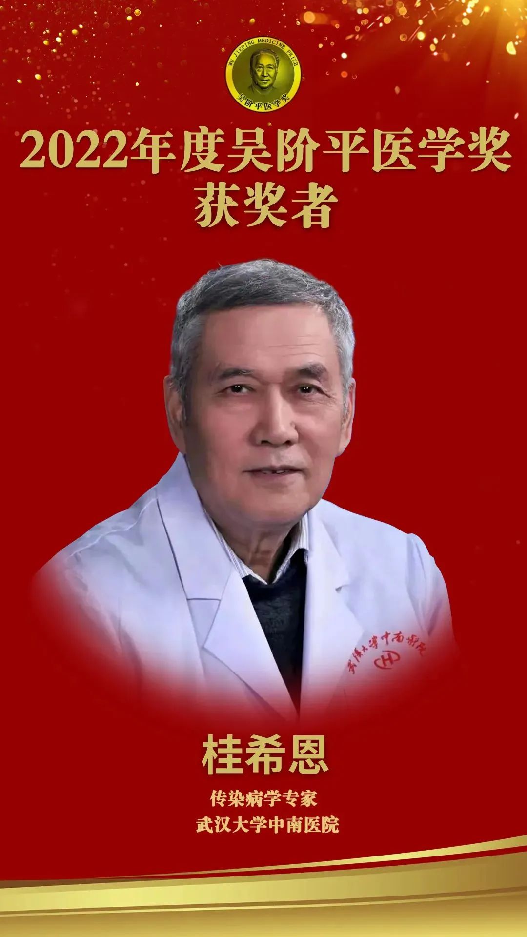 中南医院传染病学专家桂希恩教授入选2022年度“吴阶平医学奖”,目前处于公示阶段。该奖预期于11月25日在广东省中山市颁发。