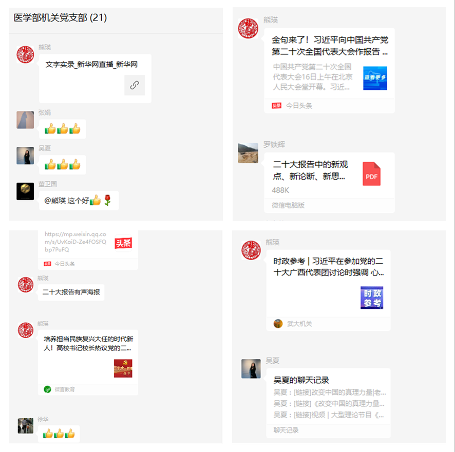 党工委副书记熊瑛:习近平总书记在大会上作的报告高屋建瓴、气势恢宏、博大精深,凝聚着全党的意志,承载着人民的期待,是一篇具有全局性、纲领性的伟大文献。习近平总书记的报告让我们更加深刻感受到实现中华民族伟大复兴的光明前景,也深切认识到高等教育肩负的特殊历史使命和重要时代责任,进一步坚定了在党的坚强领导下踔厉奋发、勇毅前行的信心和决心。我们要坚决学习贯彻落实党的二十大精神,始终高举中国特色社会主义伟大旗帜,贯彻习近平新时代中国特色社会主义思想,弘扬伟大建党精神,坚定社会主义办学方向,坚持党对教育事业的全面领导,牢固树立人民至上的理念不动摇,坚持立德树人根本任务,始终把师生需求放在第一位,努力培养担当民族复兴大任的时代新人,奋力打造武大医学人才中心和创新高地,在服务教育强国建设的征程中展现更大担当和作为!