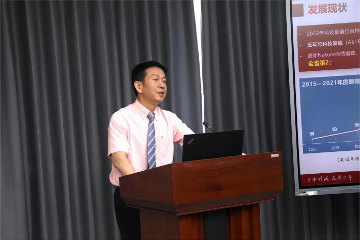 会上,中南医院院长王行环围绕医院历史与现状、目标规划与存在的问题,从文化战略、学科及科技创新平台建设、高层次医学人才培养、高水平科学研究、高水平临床研究、教学能力建设、公益担当方面介绍了中南医院近年来取得的主要成绩和重要突破,进一步分析了当前医院高质量发展中存在的“硬件”和“软件”问题,并提出医学科技综合发展目标、高层次医学人才培养目标、教学成果建设目标规划。