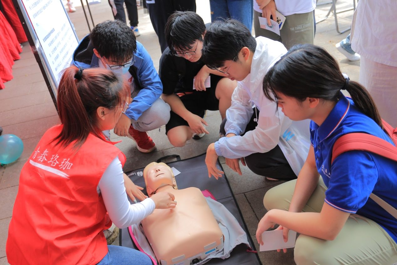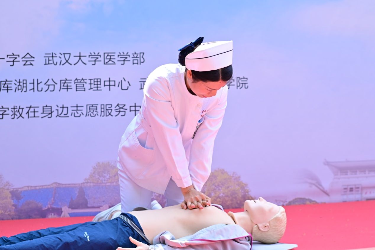 随后,中南医院神经外科病区护士长万蕾在活动现场进行了心肺复苏演示,动作专业而熟练,为在场的同学们做出了标准示范。目前心肺复苏亟需在全社会普及,一旦发生心脏骤停,抢救就是在和死神赛跑。抓住黄金时间,如果可以在现场或者在送往医院的途中进行抢救,可以为患者赢得更多的抢救时间。