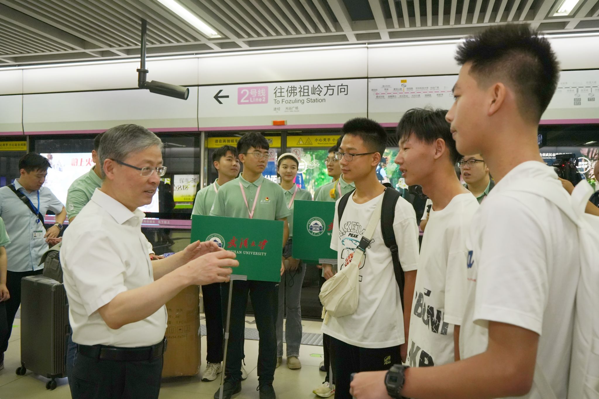 在街道口地铁站,黄泰岩、屈文谦与刚到站的新生和家长交谈,慰问了忙前忙后的学生志愿者。“武大的迎新服务特别完善,从火车站出口到地铁站车厢,全程都有学生志愿者接力。”新生家长点赞道。