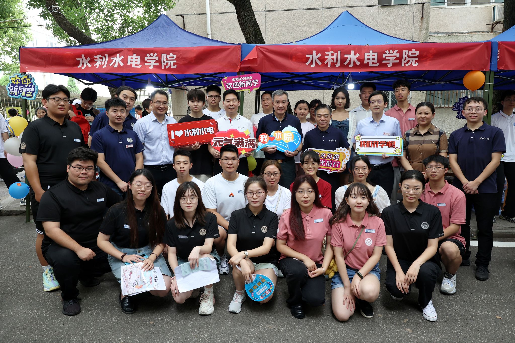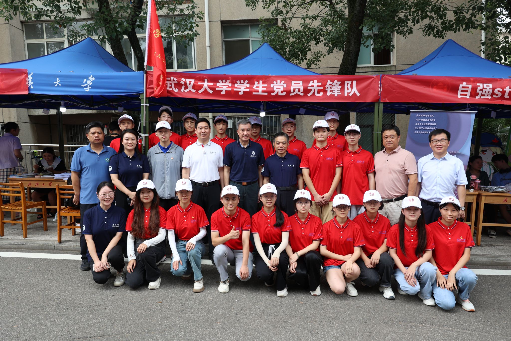 周叶中、沈壮海、唐其柱一行来到工学部体育馆前迎新点,与师生交流,慰问学生党员先锋队和学生志愿者,对他们的辛勤付出表示肯定,勉励他们坚守岗位、继续奉献、发热发光。