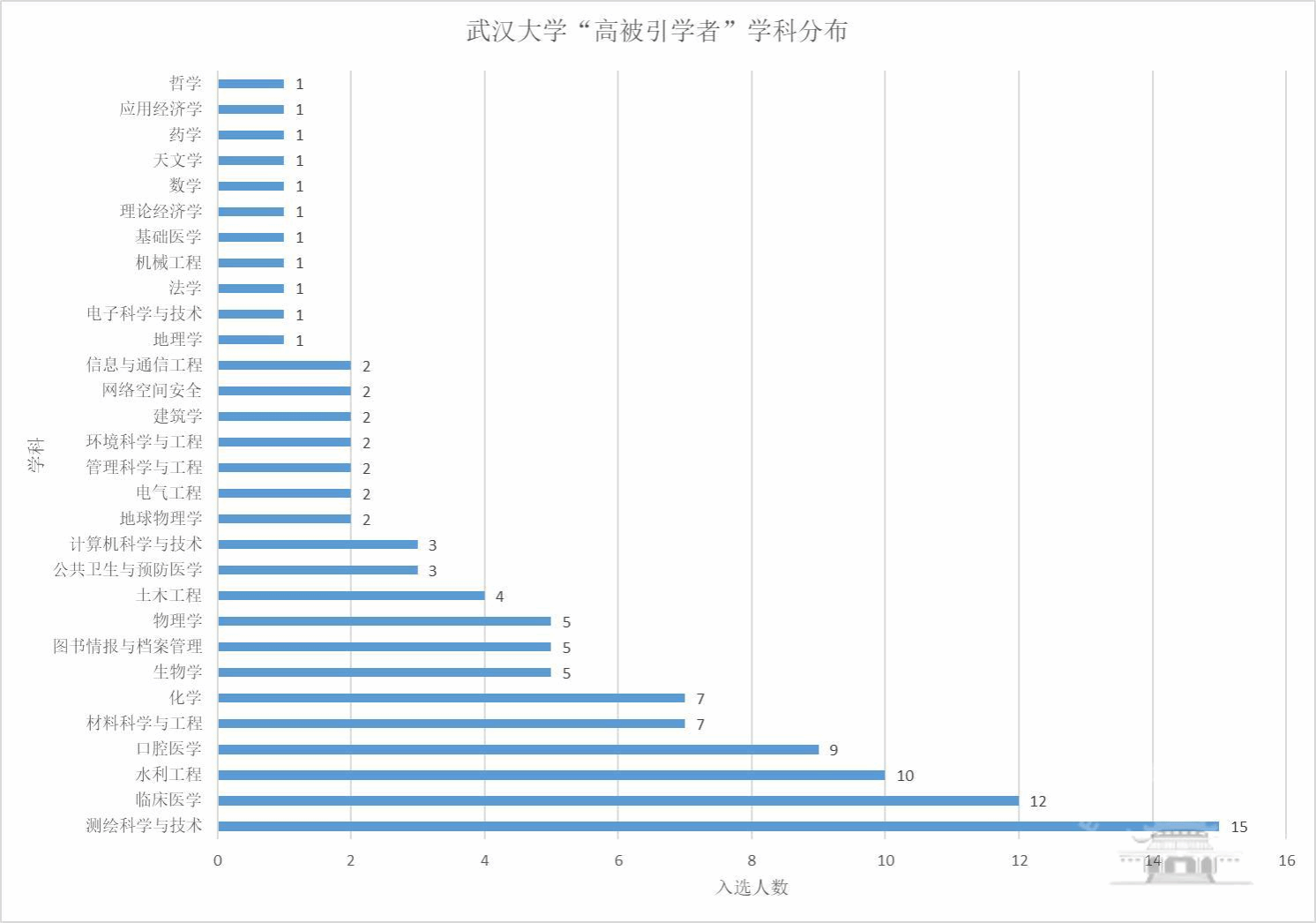 我校入选学者覆盖工学、理学、医学、管理学、经济学、法学、哲学7个学科门类,涵盖30个一级学科(详见图1),与去年同期相比增加了经济学学科门类、3个一级学科。其中,工学门类的高被引学者最多,共51人,其次是医学、理学,分别入选26人和22人。从一级学科看,测绘科学与技术(15人)、临床医学(12人)与水利工程(10人)入选学者人数居前三,口腔医学(新增4人)、图书情报与档案管理(新增2人)等11个学科入选学者较上一年度增加。学者周圣军、杨冕及Usman Muhammad的入选分别实现了我校机械工程、理论经济学与应用经济学3个学科高被引学者“零的突破”。
