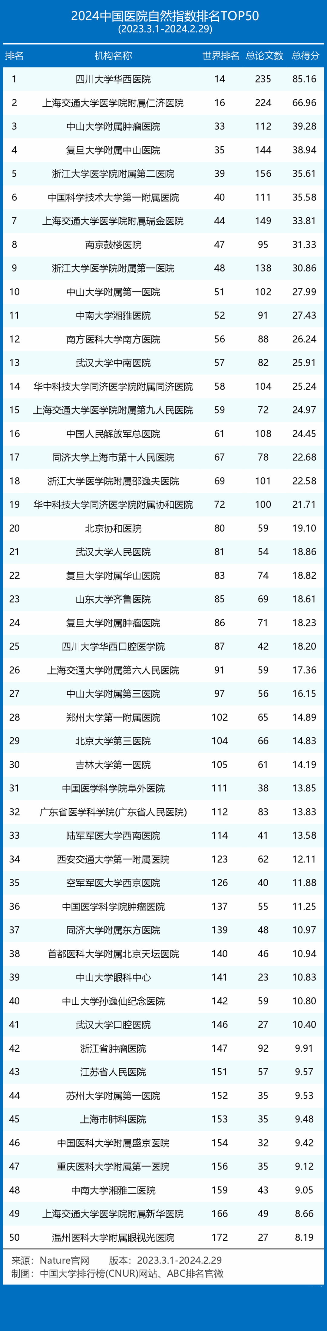 2024中国医院自然指数排名TOP50 如下。