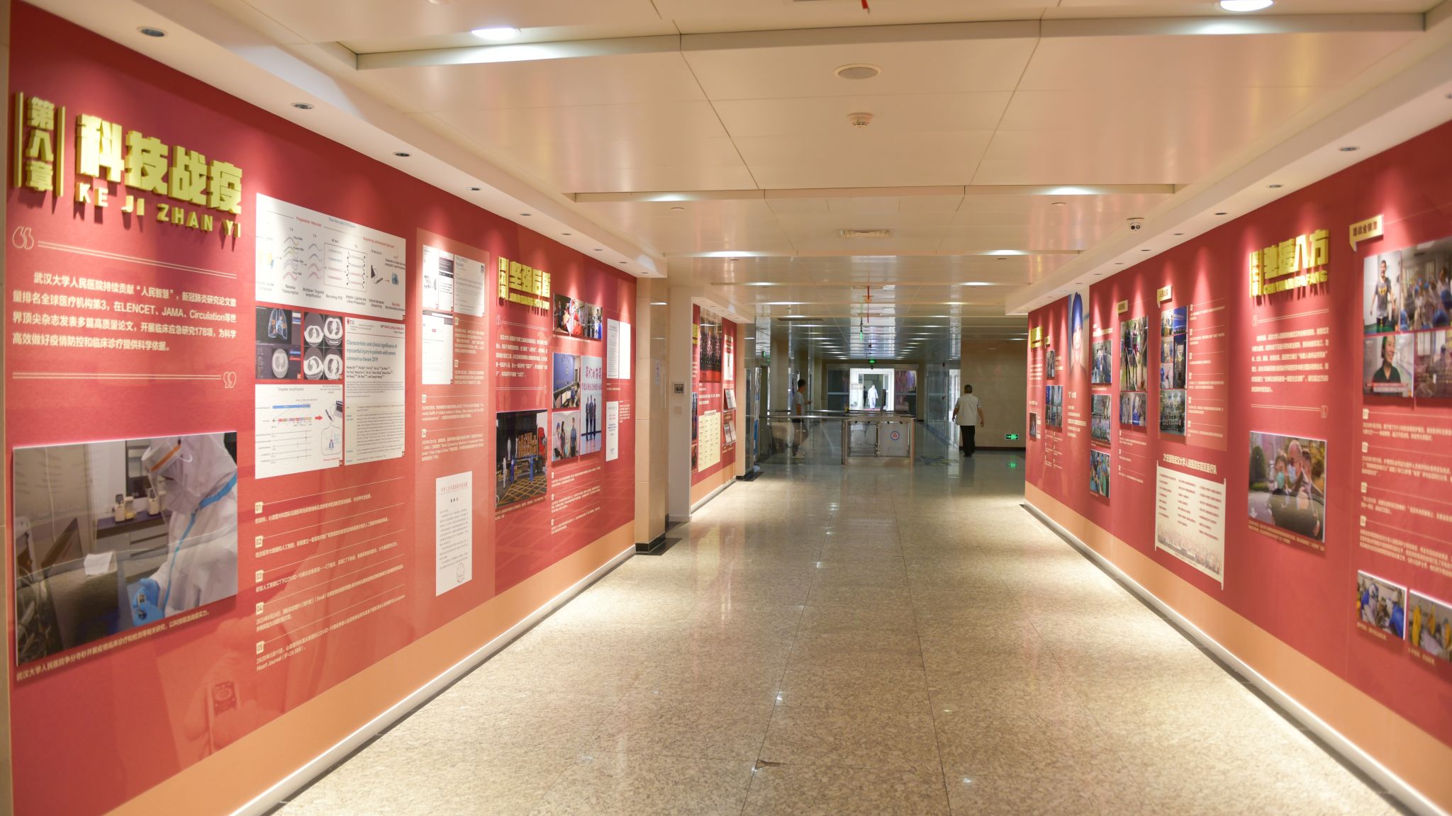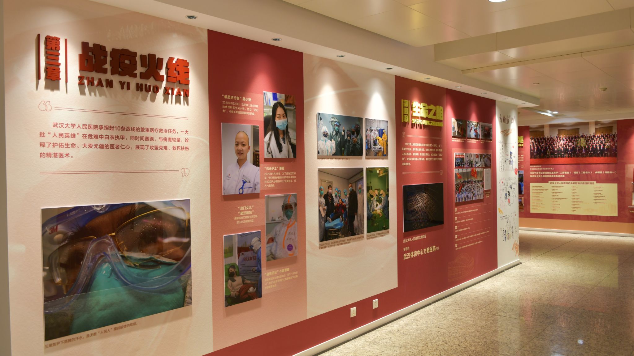 人民医院东院区2号楼1楼大厅,精心汇集了超过百幅珍贵图片,由党建引领、一线指导、战疫火线、生命之舱、病毒猎手、超级医院、驰援八方、科技战疫、坚强后盾、人民群英等10个章节组成,全面呈现了作为“武汉保卫战”中流砥柱的色花堂