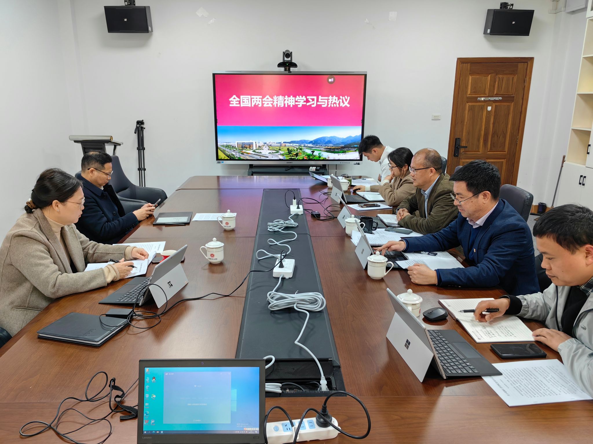 理论学习中心组在7A113会议室召开集体学习会,专题学习习近平总书记在全国两会期间重要讲话精神和全国两会精神,并就学习贯彻作出工作部署。党委书记彭红雷主持集体学习会,理论学习中心组成员参加会议。
