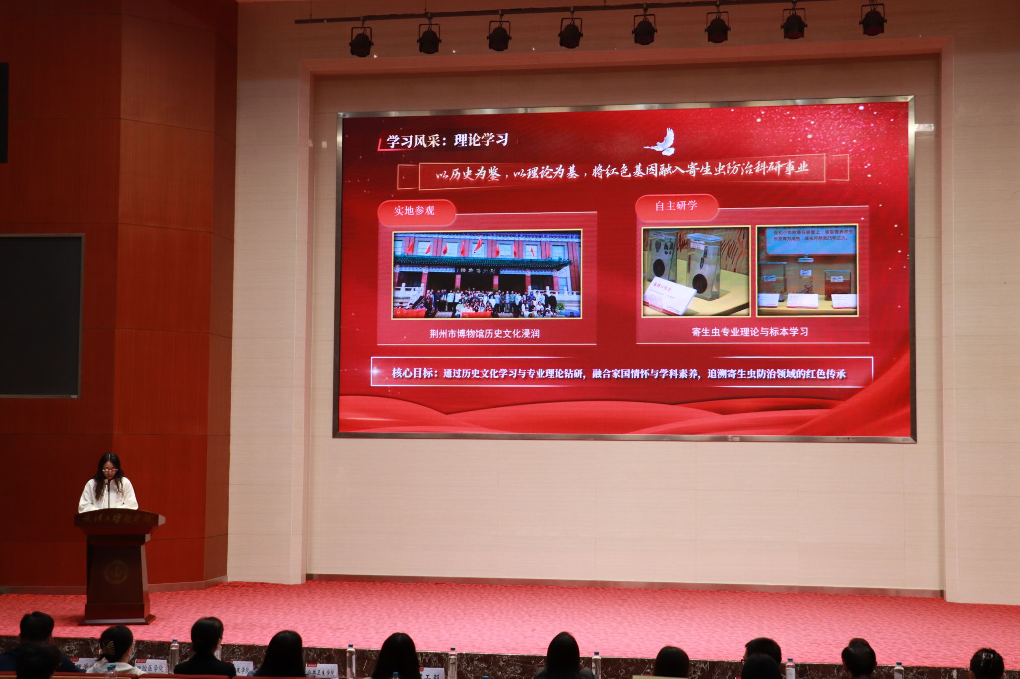 在学习风采展示环节,各支部代表紧扣党的创新理论学习、中国共产党人精神谱系弘扬、健康中国战略服务等核心主题,结合基础医学研究、药理学研究、公共卫生实践、临床诊疗、全生命周期健康护理等医学专业特色,通过PPT汇报形式,呈现扎实的理论学习成果与“医心向党”的信念追求,充分展现医学研究生党员的专业素养与家国情怀。