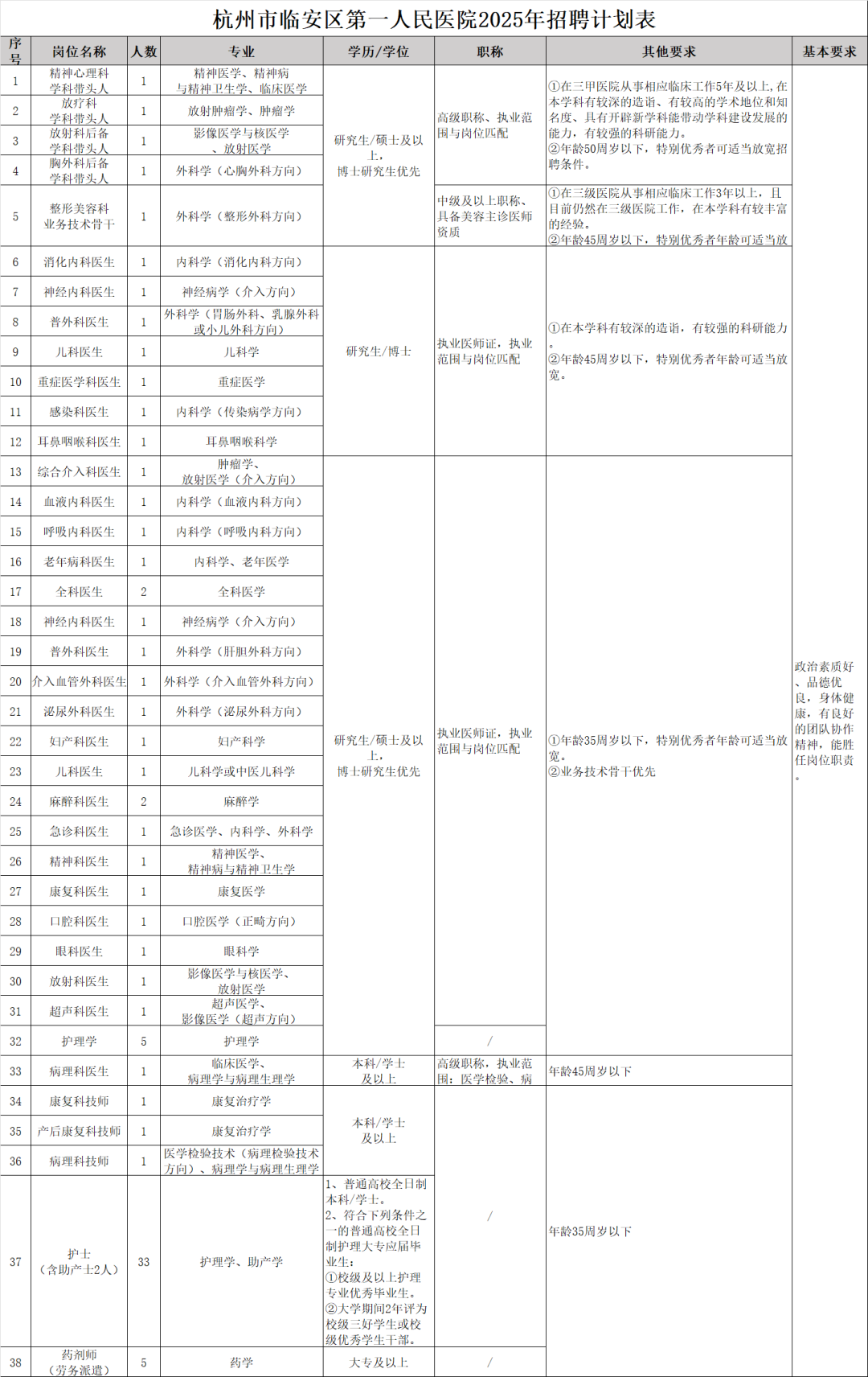 因工作需要,杭州市临安区第一人民医院将面向社会公开招聘卫技人员,现将有关事项公告如下: