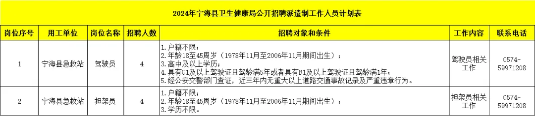 详见附件《2024年宁海县卫生健康局公开招聘派遣制工作人员计划表》。