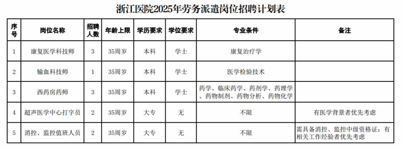 2025年浙江医院招聘劳务派遣5个岗位共11人,涉及康复医学科、输血科、西药房、超声医学中心、保卫部(消控、监控室)等科室。现将有关事项公告如下: