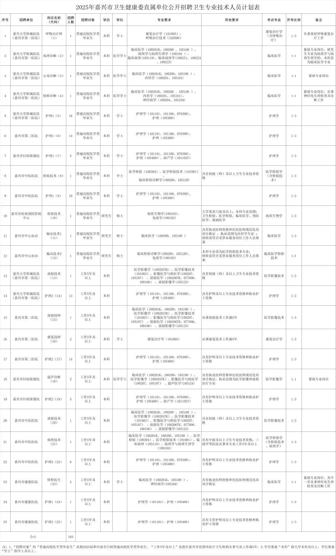 嘉兴大学附属医院(嘉兴市第一医院)、嘉兴市第二医院、嘉兴市妇幼保健院、嘉兴市中医医院、嘉兴市康慈医院、嘉兴市疾病预防控制中心、嘉兴市中心血站等7家事业单位共计划招聘临床医学、康复治疗学、放射、检验、护理等专业的卫生专业技术人员103名(详见招聘计划表)。