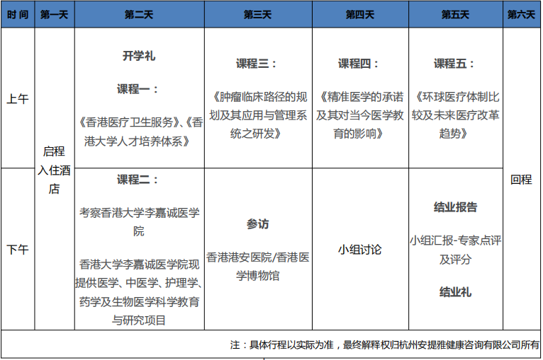 3.项目内容:邀请香港大学顶级专家和教授为学生授课,从对香港的医疗体制开始,围绕医学前沿等相关主题的讲座,增加学生对专业知识和医学领域国际前沿研究成果的认识;同时可以结识来自不同地区不同文化背景的同伴,建立人脉网络。参加的学员可以获得由香港大学颁发结业证书,根据学员的出勤率、结业汇报等完成情况,优胜小组学员获得推荐信。具体课程安排如下:
