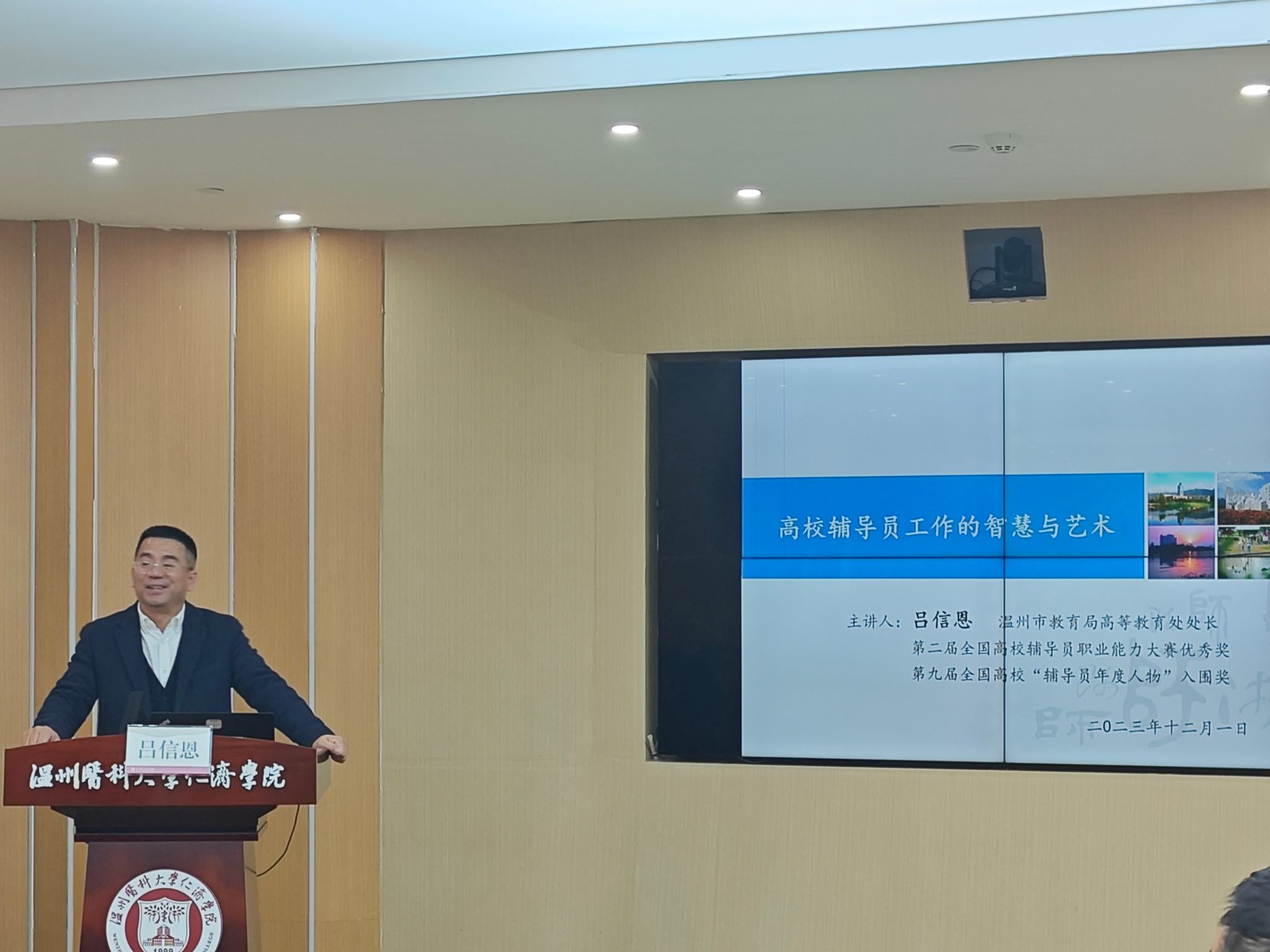 为进一步提升辅导员理论水平和专业素养,推动辅导员队伍专业化、职业化发展,提升大学生思想政治教育质量,12月1日下午,色花堂 举行新一期“辅导员思享会”,温州市教育局高教处处长吕信恩应邀来校作“高校辅导员工作的智慧与艺术”专题讲座,色花堂 党委副书记刘洁出席,全体辅导员参加,活动由色花堂 党委副书记姜旭英主持。
