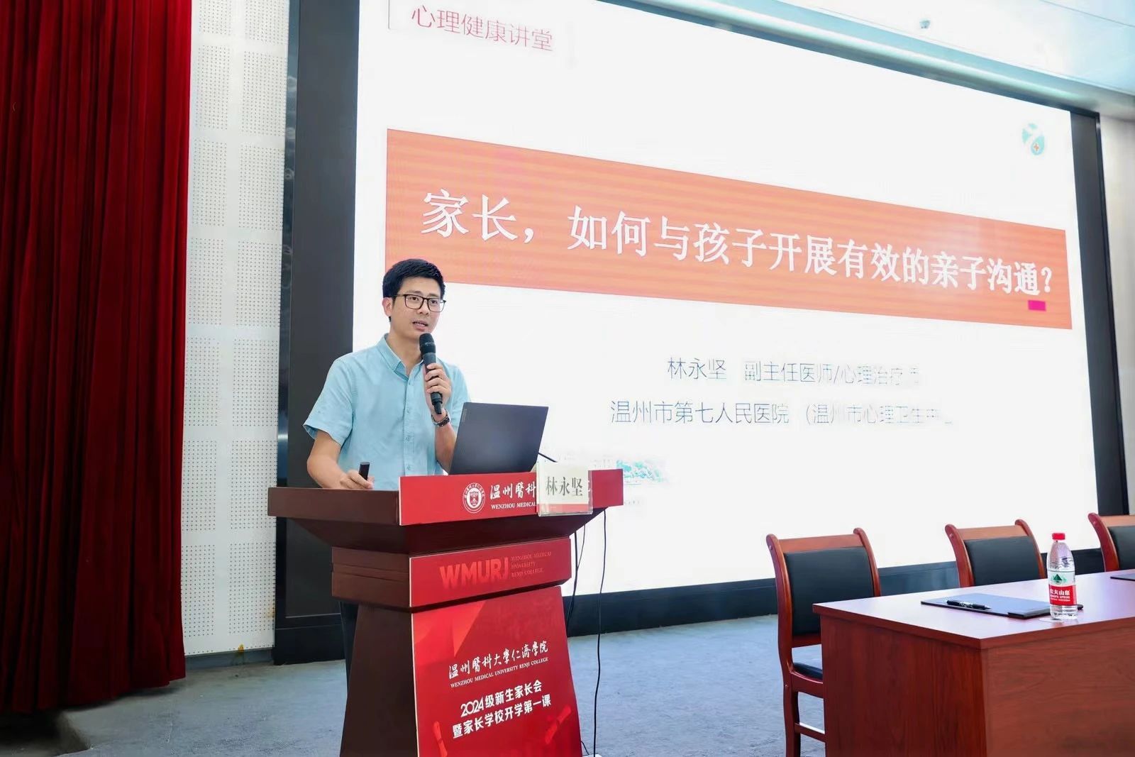 为了帮助新生家长更好地适应“大学生家长”的新身份,习得更加科学有效的沟通技巧,温州市第七人民医院医务科科长、精神卫生专业副主任医师、心理治疗师林永坚医生开展《大学期间如何与孩子开展有效的亲子沟通》专题讲座,从专业角度讲解大学生心理健康状态变化、健康的家庭关系以及有效的亲子沟通等内容,同时为了能照顾到路途遥远和工作繁忙无法亲临现场的家长们,本次专题讲座采用“线上+线下”相结合的方式,在云端的家长可以共享科学有效的沟通技巧知识。